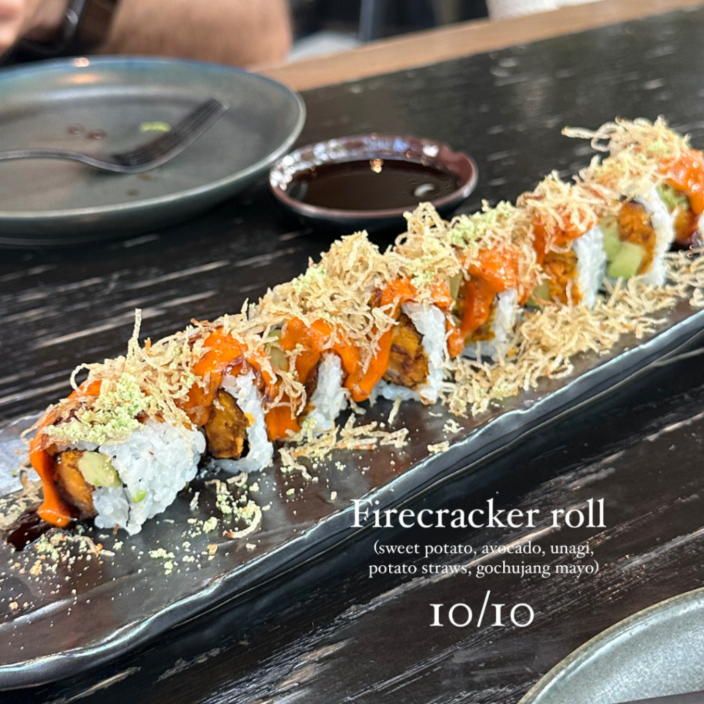 Firecracker Roll – a bold sushi roll with sweet potato, avocado, vegan unagi, crispy potato straws, and a spicy gochujang mayo. Crunchy, creamy, sweet, and spicy all in one – a flavor explosion!