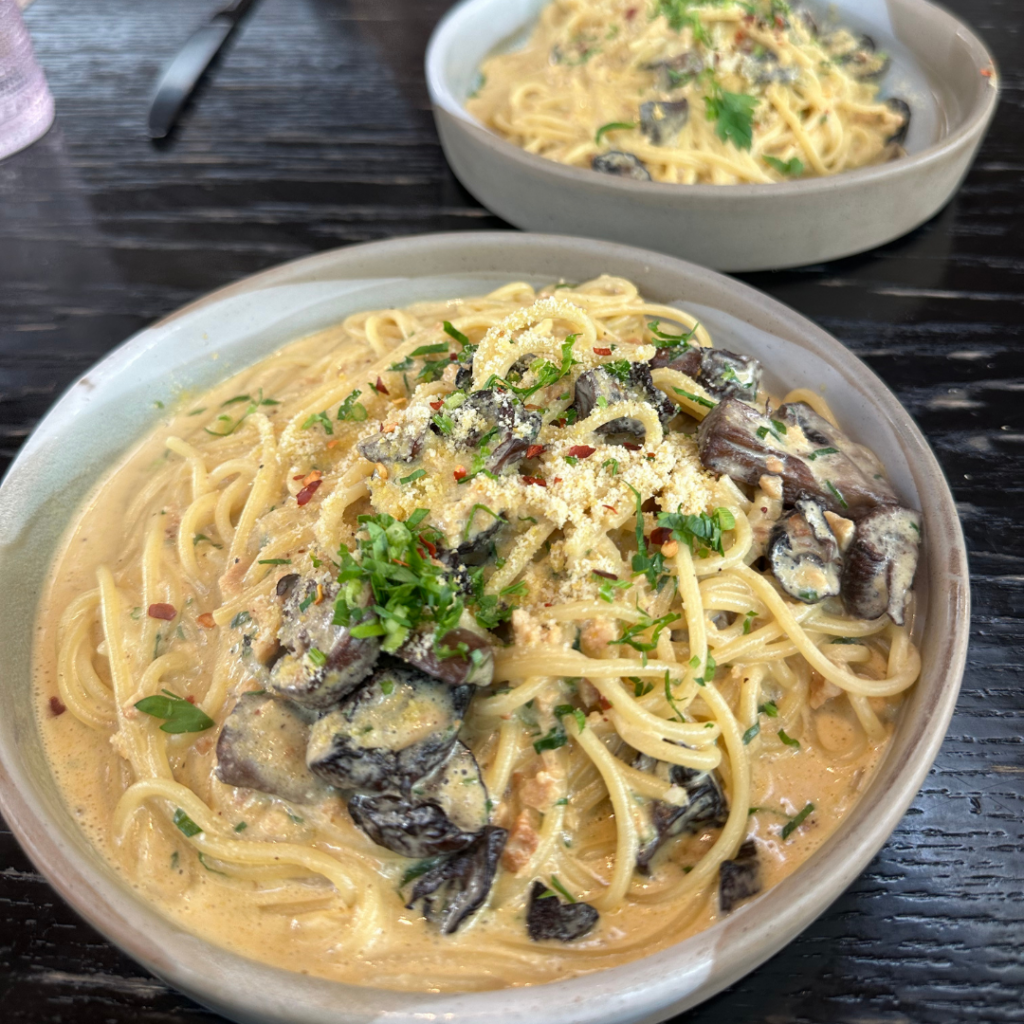 Vegan Carbonara – silky, rich pasta coated in a velvety carbonara sauce with sautéed mushrooms. Comforting and indulgent — this one completely stole my heart.