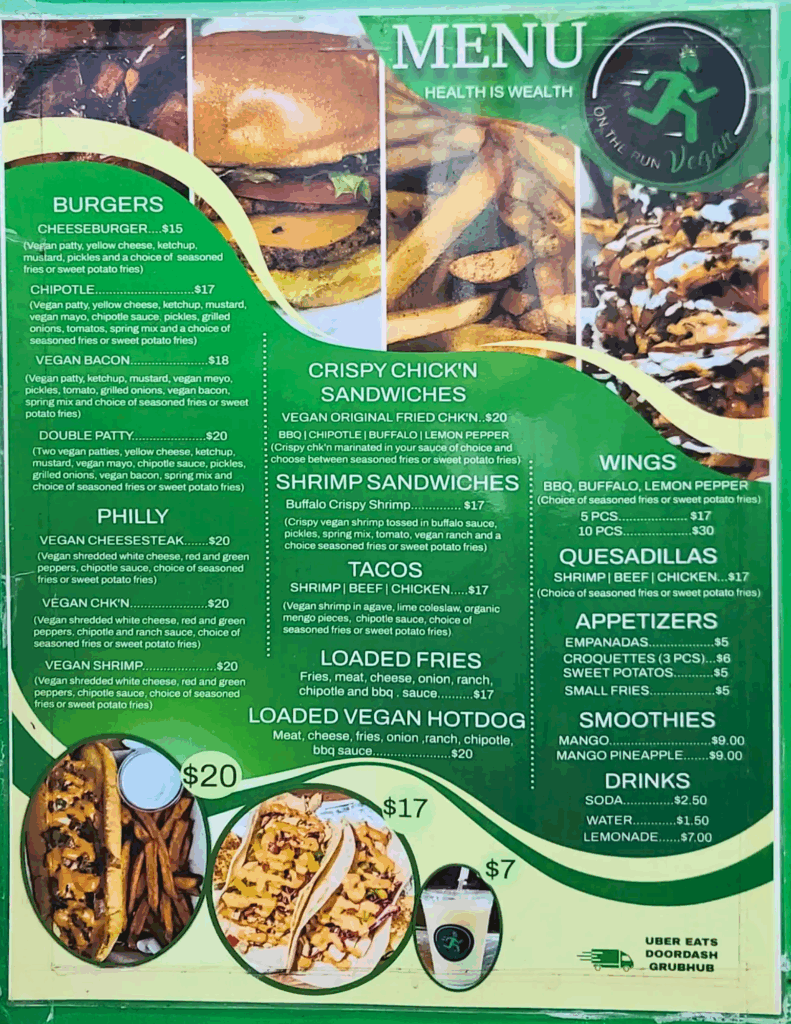 On The Run Vegan is a laid-back Miami spot serving up bold, flavor-packed vegan comfort food. The menu is loaded with crave-worthy eats like juicy burgers, crispy chick’n sandwiches, Philly cheesesteaks, tacos, quesadillas, and golden fries—all 100% plant-based and made to satisfy.